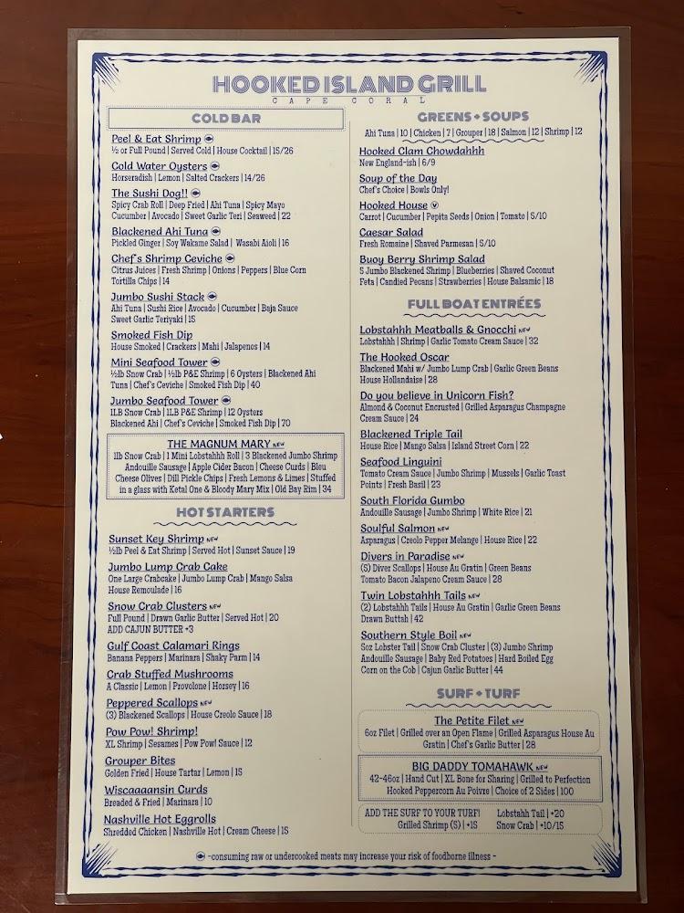 The menu at Hooked Island Grill is a seafood lover's paradise. Diners can savor specialties such as tacos de merou and gumbo with rich flavors that reflect the Gulf's bountiful offerings. Dishes like crab cakes and sliders are perfect for sharing. Drinks also shine with a variety of frozen cocktails. The happy hour makes indulging even better. Menu items cater to both adventurous and traditional tastes, providing plenty of options. With an inviting mix of appetizers, entrees, and desserts, every visit reveals delightful surprises.